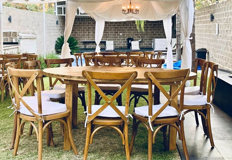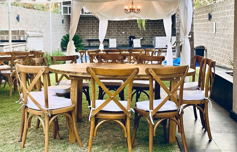 Aporta un toque de distinción orgánica a cualquier celebración con nuestra colección de madera. Somos fabricantes expertos de la icónica Silla Cross back y Sillas Avant-Garden, tratadas con barnices de alta resistencia para soportar el tráfico de eventos sociales. Complementa el montaje con nuestras mesas de madera sólida (tipo Imperial o Vintage), piezas que no requieren mantel y lucen espectaculares por sí solas, fusionando lo rústico con lo sofisticado.